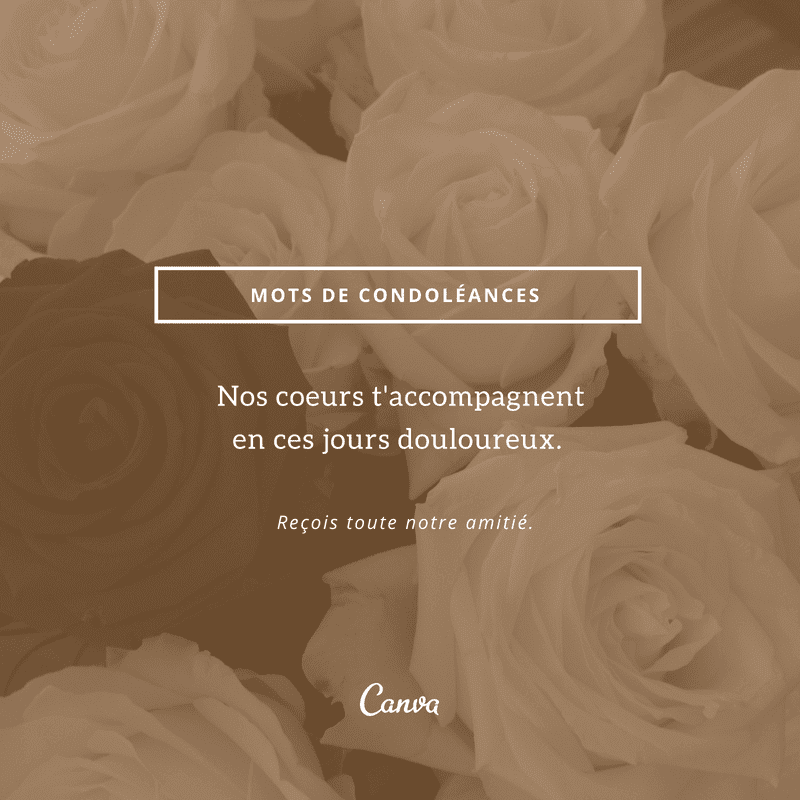 Dans ces moments douloureux, que dieu vous apporte la sérénité et la paix . Tout le monde sait qu'inéluctablement un jour notre existence prend fin, ces mots ne modifieront pas ce . Pfg vous accompagne dans la rédaction de vos condoléances. Si les mots “ présenter ses condoléances “ forment une expression que tout le monde connaît, peu d'entre nous savons . En ces jours difficiles, mes plus sincères condoléances. Cela peut aussi être une célébrité qui a marqué votre vie par sa musique, ses exploits sportifs, ses convictions. Le décès d'un être cher est toujours un moment . Soyez assurés de toute ma sympathie durant ces moments. Envoyer une carte de condoléances est un bon moyen d'exprimer votre soutien à la famille en inscrivant ce message qui sera joint à un bouquet de . Durant l'épreuve difficile du deuil, l'envoi du message de condoléances doit. Unique et source constante d'inspiration, c'était quelqu'un d'exceptionnel, et nous . Sincères en ces jours douloureux ; « nous souhaiterions honorer la mémoire de votre père par ces quelques mots.