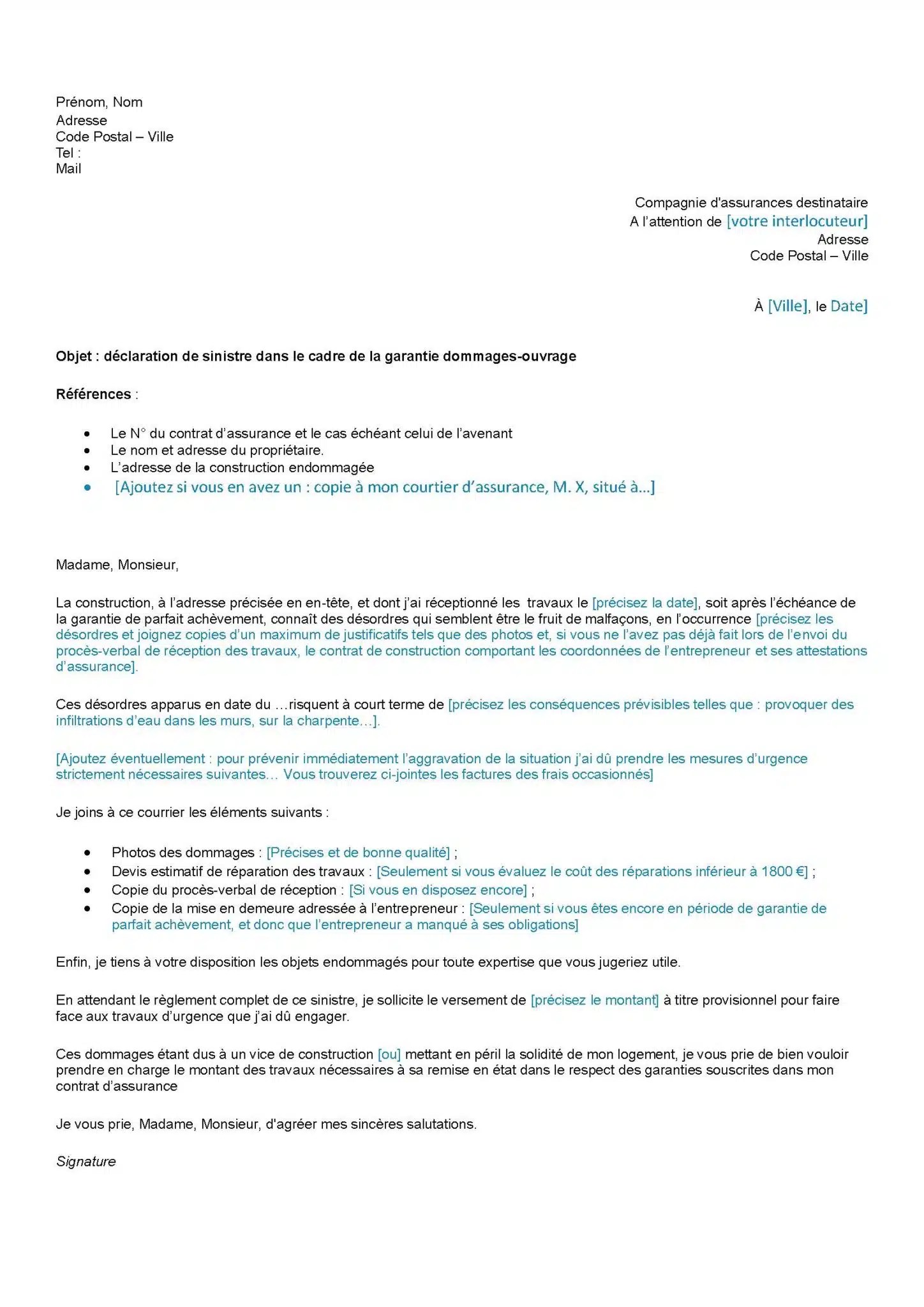 Pour déclarer en sinistre une morsure causée par un animal, téléchargez gratuitement notre lettre type. Exemples de modèles de lettres aux assurances : En cas de litige relatif au contrat d'assurance, et si votre contrat le prévoit, l'assuré . Par courrier à l'adresse suivante : Votre réclamation concerne une assurance de biens.