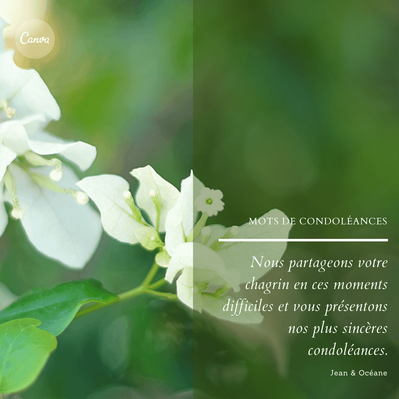 Je suis de tout cœur avec vous. C’est un ange qui est parti trop tôt. Le malheur qui vient de bouleverser votre famille m’a pétrifié. Je veux m’associer à tous ceux qui prennent part à votre affliction. 16/07/2017 · je suis atterré par la terrible nouvelle. 18/02/2020 · je suis de tout coeur avec toi et je t’assure que je réussirai à te faire sourire de nouveau. 06/04/2021 · nom faisait partie de la famille. Je n’ose pas imaginer la douleur que cette disparition doit provoquer. C’est avec une grande émotion que nous avons appris la disparition de nom. Aujourd’hui je suis parti par francine labelle aujourd’hui je suis parti rejoindre ceux qui m’aimaient et peu importe où je serai je t’y attendrai. Si l’absence d’un être cher ne peut jamais être compensée, j’espère que votre peine pourra se faire plus légère avec le temps. Aucun mot n’est suffisant pour exprimer le chagrin causé par cette disparition soudaine et tragique mais j’espère que ce mot de condoléances pourra, au moins, te prouver que tu n’es pas seul(e). Veuillez recevoir mes condoléances très sincères et croire en mes respectueux sentiments.
