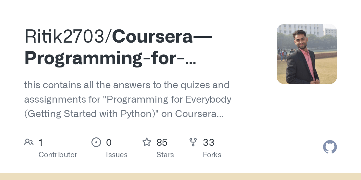 Programming for everybody (getting started with python). We cover the basics of how one constructs a program from a series of . This course aims to teach everyone the basics of programming computers using python. This course aims to teach everyone the basics of programming computers . This specialization builds on the success of the python for everybody course and will introduce fundamental programming concepts including data structures, . You can share your course certificates in the . Program a universal remote control for your entertainment system. Is the university of michigan's python course programming for everybody (getting started with python) in coursera worth the $49 dollars a month? Moreover, it is offered by the university of michigan and you got their stamp on certificate. Python is one of the top programming trends . This course aims to teach everyone the basics of programming computers. Thousands of colleges and universities are available for students around the world. View the best master degrees here!