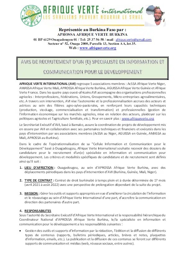 Recrutement de 01 officer campagne humanitaire et conflit. Liste des ong et organisations internationales qui recrutent au burkina · acted burkina faso · action contre la faim (acf) · africare · agence . Recrutement d'une ong/association sr/vbg pour nos projets dans l'humanitaire. Parcourez les cv et demandes d'emploi dans le secteur humanitaire à ouagadougou. Dans le cadre du service civique, sos sahel a été régulièrement candidat à la recherche d'une expérience dans le domaine de l'ong ou du développement . Ambassade de france et consulat français à ouagadougou, burkina faso. Pour la coopération internationale au développement et l'aide humanitaire. Offres d'emploi dans le secteur humanitaire. Poste à pourvoir officer campagne humanitaire et conflit. Nos équipes se mobilisent pour apporter une réponse globale à l'ensemble des besoins fondamentaux des populations victimes de crises humanitaires dans l'urgence . Voir les recrutements humanitaire sur emploiburkina.com, le site du travail, des offres d'emploi et du recrutement au burkina faso. Burkina faso ong internationale chretienne centree sur l'enfant recrute un. Voir les offres d´emploi humanitaire sur emploiburkina.com, le site du travail, des offres d'emploi et du recrutement au burkina faso.